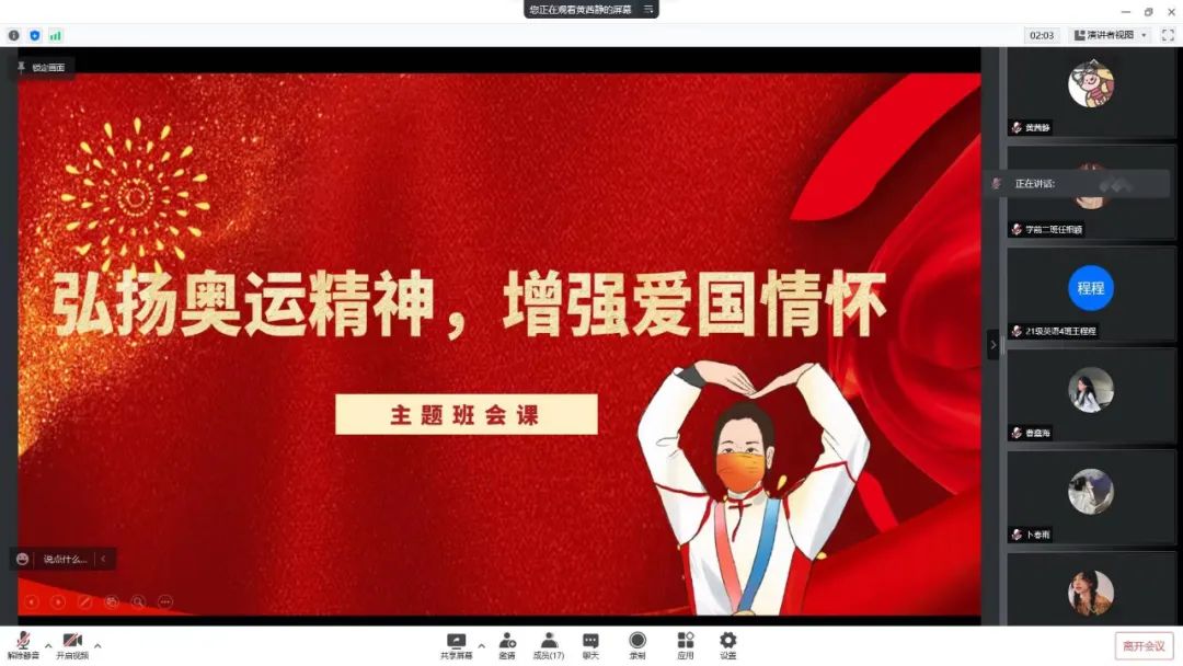 完美(中国)一站式服务平台在2022年3月4日,为20级21级全体学生开展了开学第一课活动。受疫情影响,通过线上形式,组织学生开展爱国教育。帮助学生树立国家认同,培育爱国情怀。