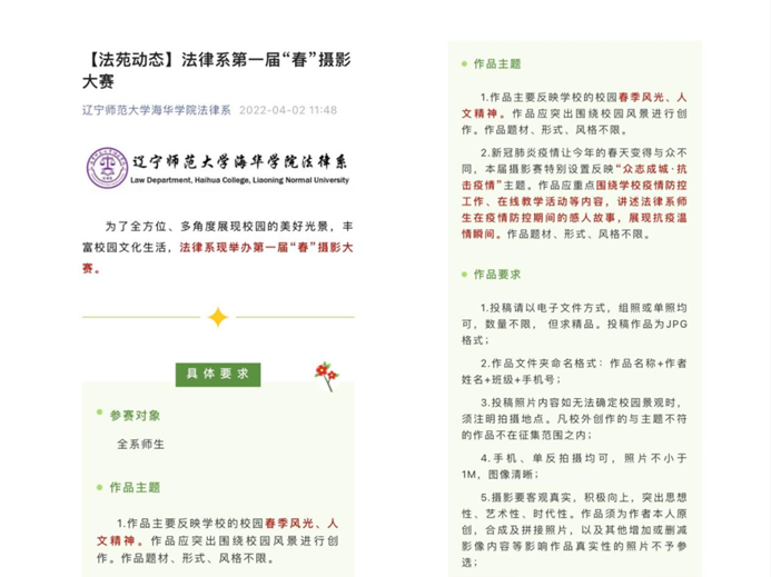 法律系系列推出《每日“疫”法》,教育引导师生依法抗疫,增强守法意识,主动报备行程轨迹,积极参加核酸检测,遵守疫情防控政策要求;组织开展以“众志成城抗击疫情”为主题“春”摄影大赛,丰富师生业余文化生活,讲述师生疫情防控期间感人故事,展现温情瞬间,引导师生热爱大美校园,激发师生坚持抗疫的斗志。