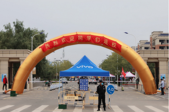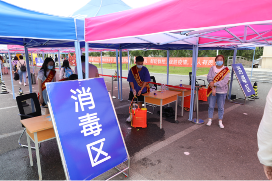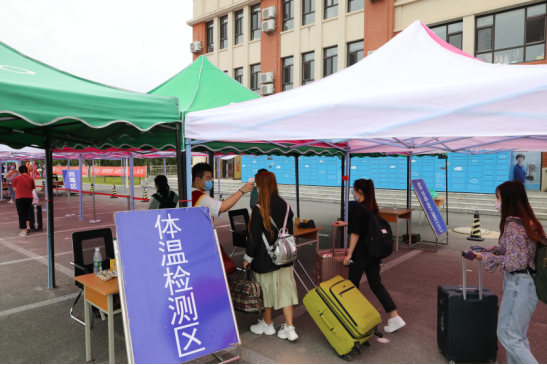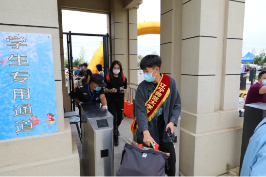 当天一早,学生陆续进校,每人间隔1米以上排队进行一系列检测。校门口实施“一消二测三核四查五通过”,喷洒消毒,测量体温,核验身份、查验健康码,符合条件的学生方可通过。现场各环节分工明确,安全高效。学生进入宿舍还需经过二次体温检测和身份核实,为安全再加“砝码”。