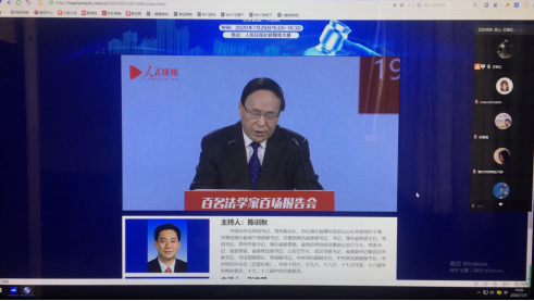 本次报告会主题为:宣传贯彻《中华人民共和国民法典》,报告会由中国法学会党组书记、常务副会长陈训秋主持,中国法学会党组成员、学术委员会主任张文显主讲。