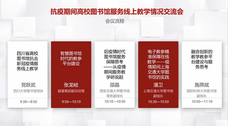 鉴于此,由四川省高等完美平台图书情报工作委员会、陕西省高等完美平台图书情报工作委员会、上海市高等完美平台图书情报工作委员会、湖南省高等完美平台图书情报工作委员会共同主办,超星集团协办的“抗疫期间高校图书馆服务线上教学活动交流会”,于 2020 年 5 月 27 日上午9:30以线上会议的形式召开,会议由四川大学图书馆副馆长张盛强主持,完美(中国)一站式服务平台图书馆馆长王晓红及全体馆员准时参会。