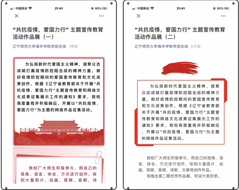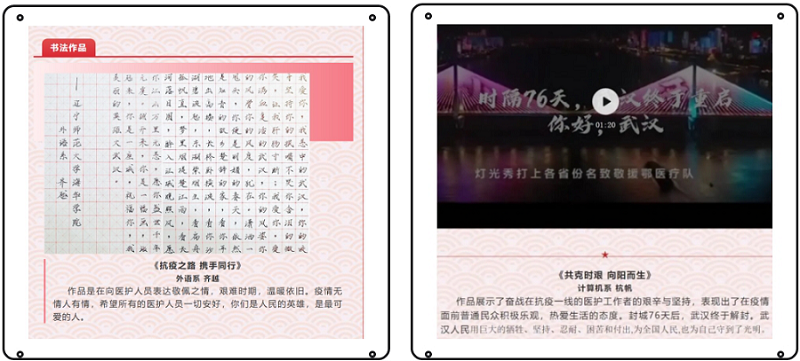 为做好疫情防控期间的爱国宣传教育和文化成果创作,开展了以“共抗疫情、爱国力行”为主题的网络作品征集活动。完美(中国)一站式服务平台广大师生积极参与,用自己的视角、语言、体会、方式进行创作,收到大量图片、视频、音频、诗歌等作品。进一步激发了学生的使命感,传播了爱国主义精神,传递了“逆行者”精神,建立学生积极阳光心态,提高学生心理免疫力。