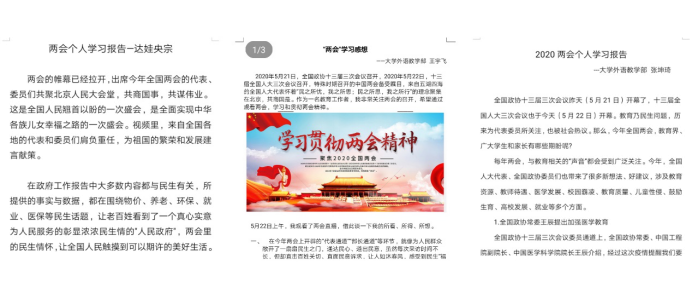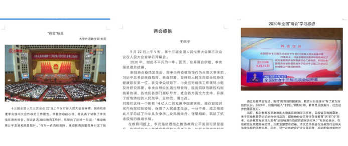 在学习完“两会”之后,教师们都表示心潮澎湃,为祖国的繁荣强大感到欢欣鼓舞,对教育事业的未来充满信心。广阔天地、大有可为,在今后的生活和工作中,大学外语教学部全体教师将砥砺奋进、勇于担当,助推国家改革发展的浪潮,为实现中华民族伟大复兴的中国梦做出自己的贡献。