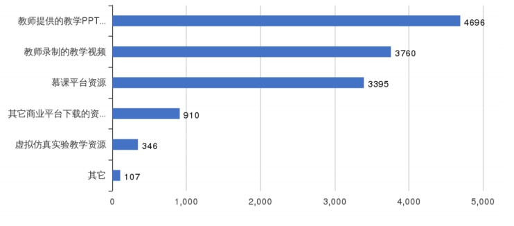 根据数据显示,学生的在线学习方式呈现均势多样状态,得益于各课程任课教师提供的多种教学资源获取方式及众多的线上教学指导,满足学生在线上学习过程中的差异化、个性化需求。