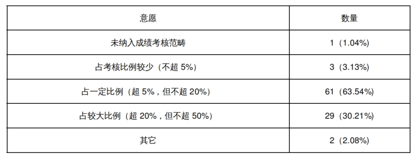 有96.88%的任课教师已将学生线上教学活动按照不同比例纳入到课程成绩考核范畴,有助于激发学生参与线上教学活动的积极性,也可促进传统课程评价模式的优化改革,推动学院教育教学信息化发展进程。