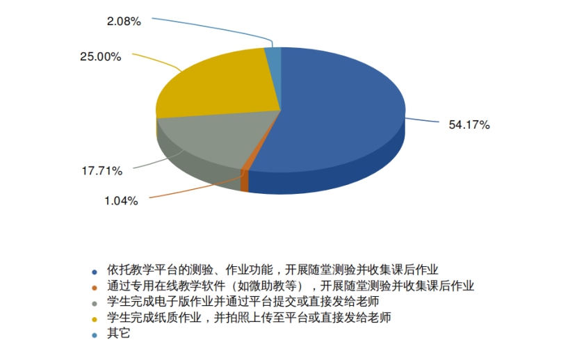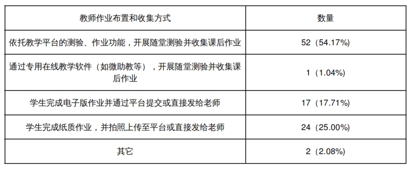 有54.17%的任课教师采取“边教边测”、“边教边评”的作业布置及阶段测试方式,体现出线上教学独有的即时性特征,有助于教师及时掌握教学动态、获取教学反馈信息,有效保障线上教学的学习效果,有25%的任课教师采用纸质作业上传电子版的方式,充分体现线上、线下相结合的教学模式变化。
