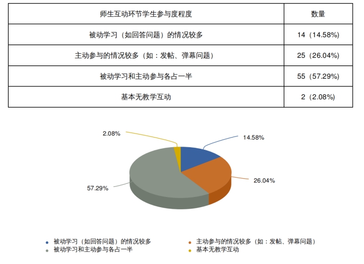 有83.33%的学生能够主动参与任课教师设置的线上互动环节,另有14.58%的学生能够被动的参与到线上互动教学环节中,仅有2.08%的学生未参与,数据表明,任课教师设计的线上教学互动,能够充分的调动学生参与线上教学的积极性,通过线上实时答疑、讨论等方式,使学生成为课堂主体,升华线上课堂学习效果。
