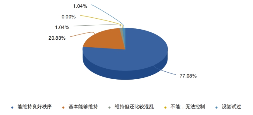 数据显示,有97.91%的任课教师在线上教学实施期间能够有效地维护教学秩序,仅有1.04%的教师未进行教学秩序维护。数据表明,线上教学期间,可实现实时教学秩序维护,并能够有效提高线上教学质量,确保线上、线下学习内容之间的等质衔接。