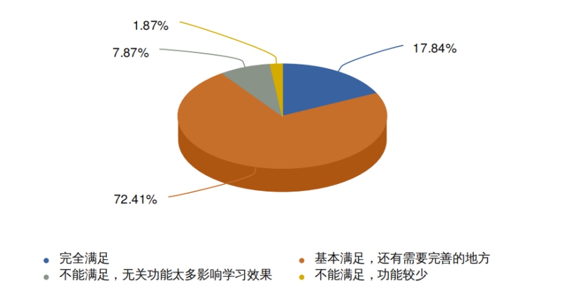 通过数据分析,有90.25%的学生认为学院提供的线上学习功能基本可以满足课程学习需要,并能够运用多种流动媒介完成相关学习任务,体现出线上学习的灵活机动性,仍有9.74%的学生认为功能不够完善或者有多余的功能影响学习效果,这也是线上平台功能有待完善之处,学院将陆续推出改进措施,强化学生学习体验。