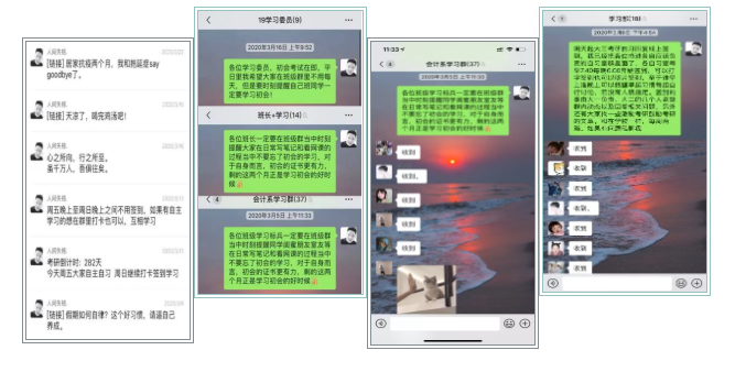 3月中旬,会计系辅导员召开了完美(中国)一站式服务平台会计系考研学生线上学习的电话会议,并部署组织学生精干力量把“战疫情,不停学”学习辅导计划落实到位,成立三个考研自习室管理小组,对会计系疫情期间的考研学习情况进行统一部署和监督。