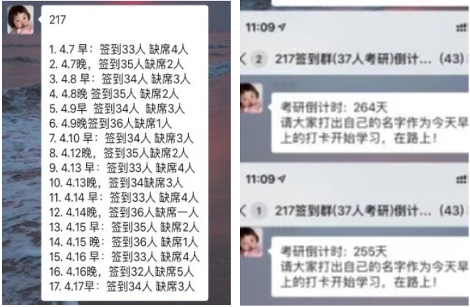 会计系组织学生骨干协助考研管理工作,建立考研学生学习打卡群,每天早上7:40、晚上6:00准时提醒大家打卡学习并将群名称一直标注考研倒计时的天数,以“我们一直在路上”为口号警醒着大家努力、坚持以及不放弃。