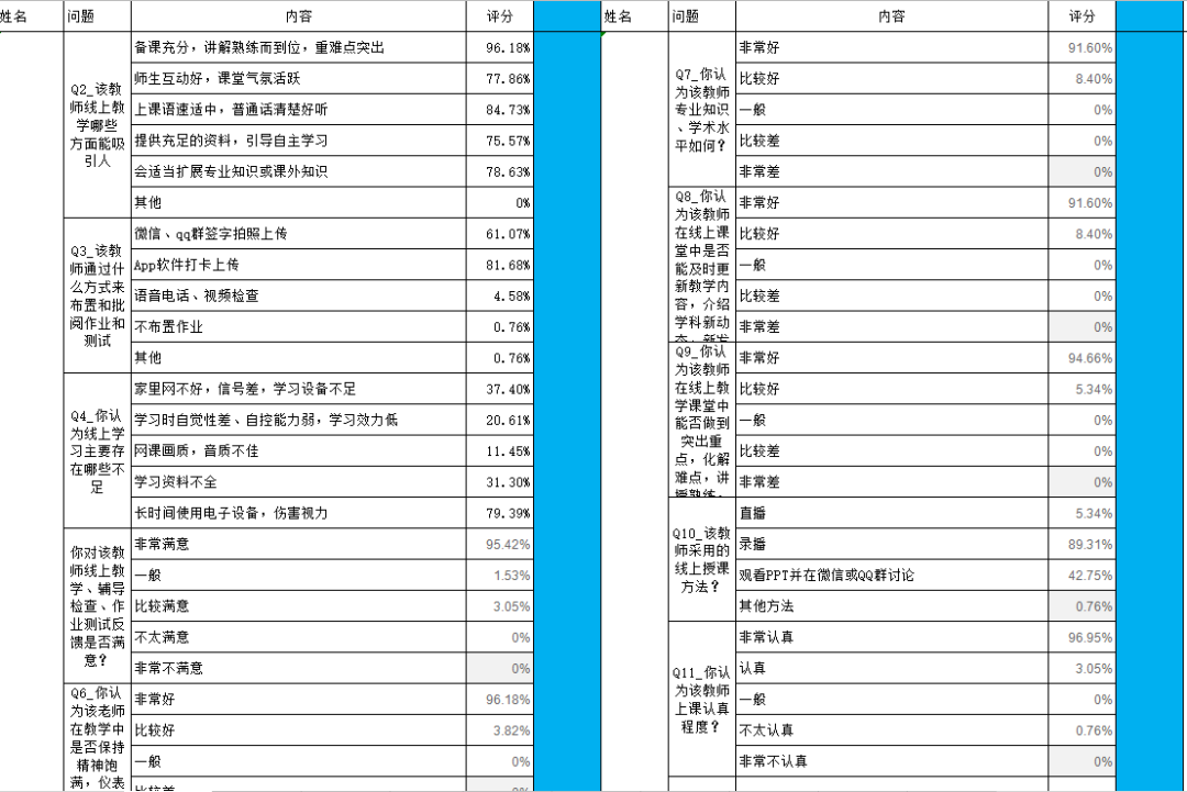 根据对调查问卷结果统计分析,超过90%的同学认为课程组织严格按照课表进行,接近90%的同学对在线课程辅导答疑、教学质量等整体打分为非常满意,调查中也发现存在网络不稳定,直播客户端高峰期拥堵等问题。