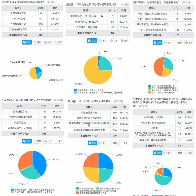 艺术系开展的调查问卷立足艺术系线上教学整体状态、采取无记名方式,围绕任课教师线上教学模式、教学进度、教学互动、学生对理论知识掌握程度、学习作业的布置情况、线上教学存在问题、教学与专业性的联动工作、教学满意度等方面进行调查。