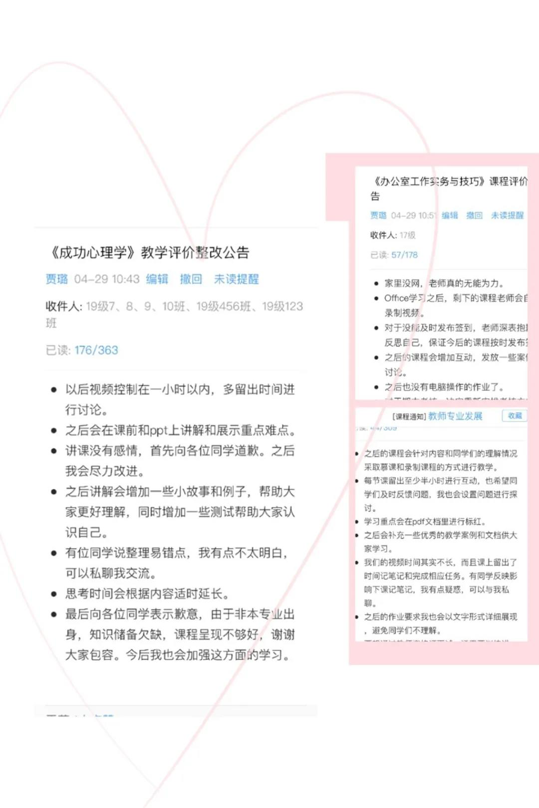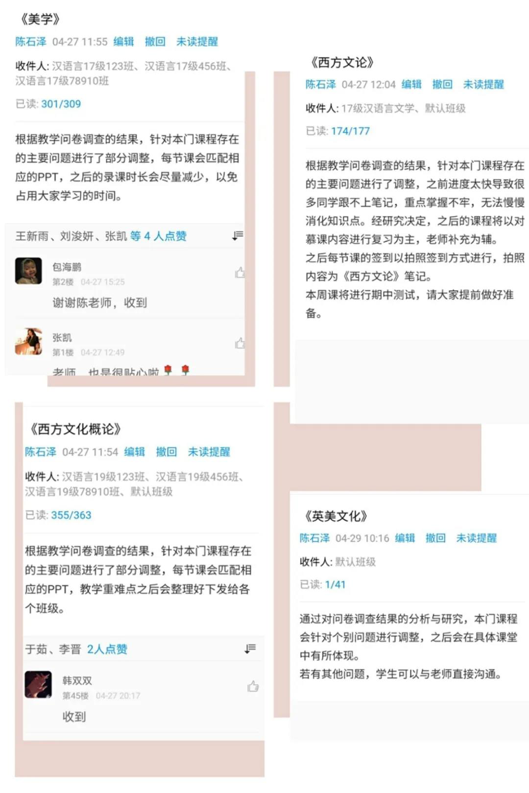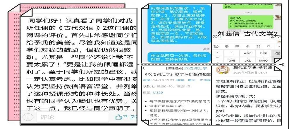线上教学以来,中文系多次召开线上教学视频会议,努力确保教学质量,但一些细节问题还是会影响着线上教学的质量。调查问卷活动结束后,中文系第一时间召开视频会议,研究部署线上教学整改措施的落实。目前,各位教师“以学生为中心”,已将线上教学整改落到实处,通过网上课堂“通知”,向学生公告了课程的教学形式和教学安排的调整情况。