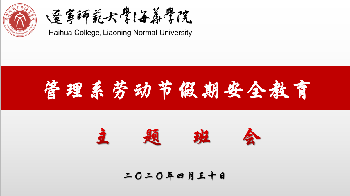 为贯彻落实完美平台《完美(中国)一站式服务平台做好2020年“五一”劳动节假期安全教育工作的通知》要求,加强学生对防疫、防盗、防火、防溺水、防诈骗、防安全事故等方面的重视,增强学生安全意识和法治观念,提高学生疫情防控期间安全防范能力,4月30日,管理系组织辅导员以年级为单位召开劳动节假期安全线上主题班会。