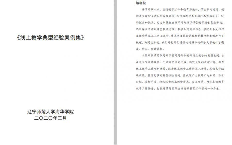 开学两周以来,我院在线教学工作平稳有序进行,学生参与度高,广大教师们注重教学互动和形成性评价,在网络教学和直播技术方面有了一定的探索和提高。为力争保证在线学习与线下课堂教学质量实质等效,不断探索开学后课堂教学与线上教学如何有机结合,学院教务处组织各教学单位深入网上课堂,对涌现出的大量的典型教师和案例进行了梳理,编辑发布了我院部分教师《线上教学典型经验案例集》。该案例集汇总了我院20余名教师在线教学的典型经验,旨在为全院教师提供一个学习交流的平台,倾听大家的教学心得,助力学院线上教学工作顺利开展。