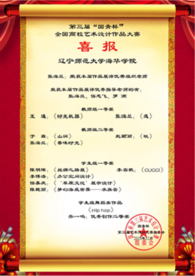 在“国青杯”大赛中,教师任志飞、张海兰、罗燕、李京点和吴明洲获得优秀指导教师称号,教师王通、张海兰、赵颖丽和于淼的作品获得一等奖和二等奖,学生获奖作品共计26件,参赛作品形式多样。