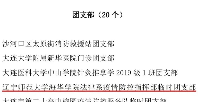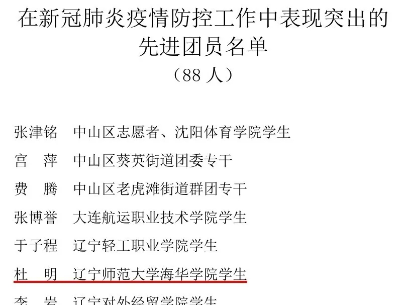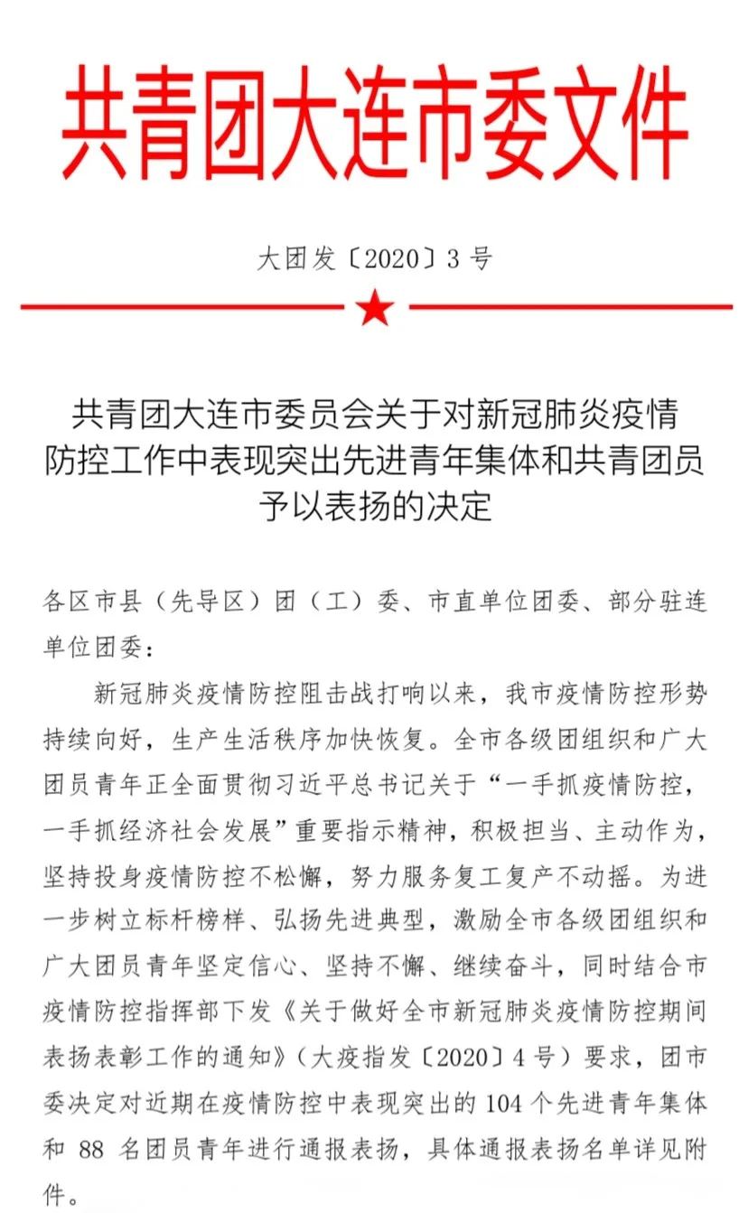 近日,共青团大连市委决定对近期在疫情防控中表现突出的 104 个先进青年集体和88名团员青年进行通报表扬,完美(中国)一站式服务平台“法律系疫情防控指挥部临时团支部”、志愿者法律系杜明同学荣登“光荣榜”!