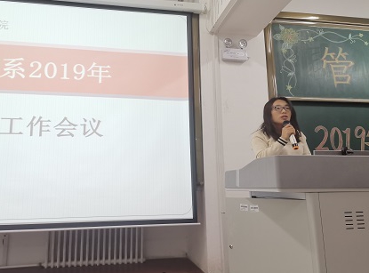 会议首先由管理系学生工作负责人郎志军老师对2019年管理系学生工作做了全面总结。她说,根据学院要求,我系本学年学生工作稳步落实,并取得了一定成绩。我系积极组织了多项专业相关活动、考研学术讲座、学风建设交流座谈会、2019级新生迎新晚会等;同时,激励落实了奖助学金以及荣誉称号的评选工作,有效开展了管理系学生干部、班干部的培养工作。在学风建设方面也取得较好成绩,绝大多数学生能够自主、积极的学习。