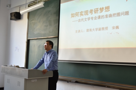宋巍教授的讲座题目是《如何实现考研梦想——古代文学专业课的准确把握问题》。他从古代文学的学科现状到目前各高校研究生硕士学位点的招生情况,从古代文学学科特点,讲到古代文学专业课的准确把握问题,指导大家如何以朝代时间为序,梳理中国古代文学流变历程,并以《诗经》和汉代文人五言诗为例,阐析作家作品在历史中的流变规律。特别是古代文学考研学习中如何对重要经典作家作品进行把握的问题。