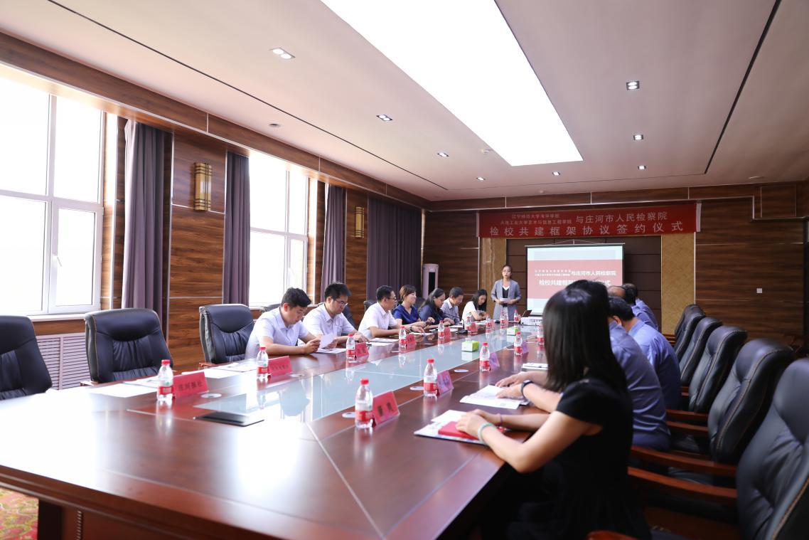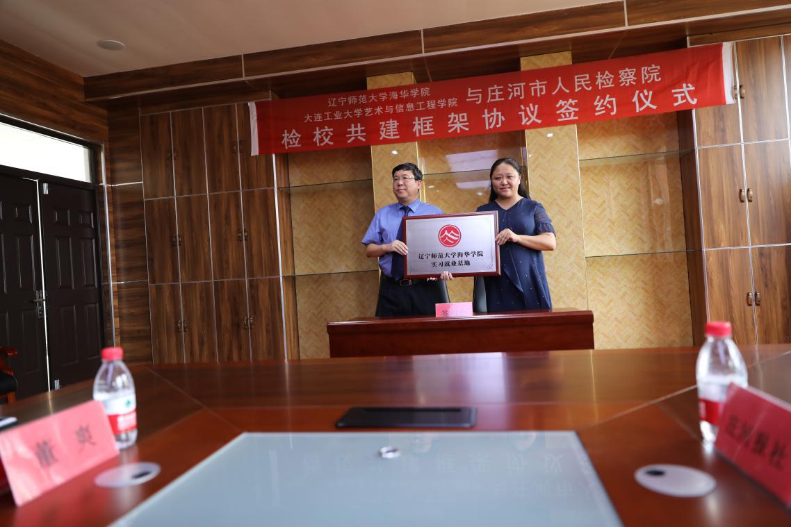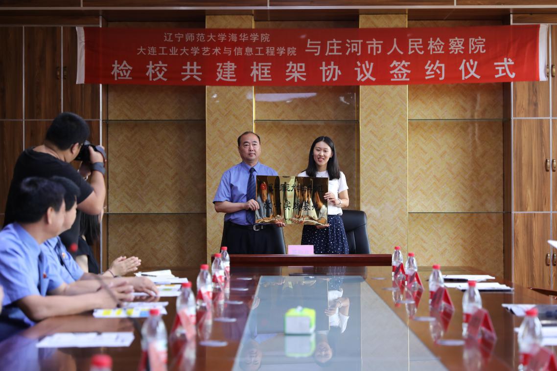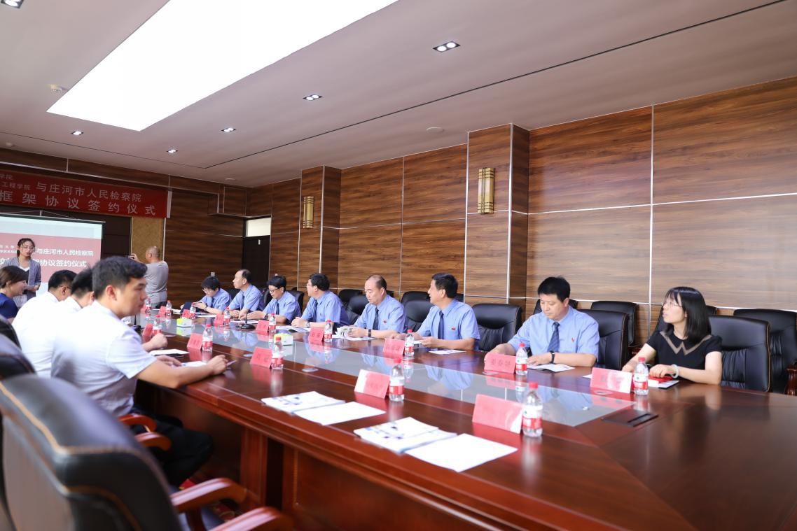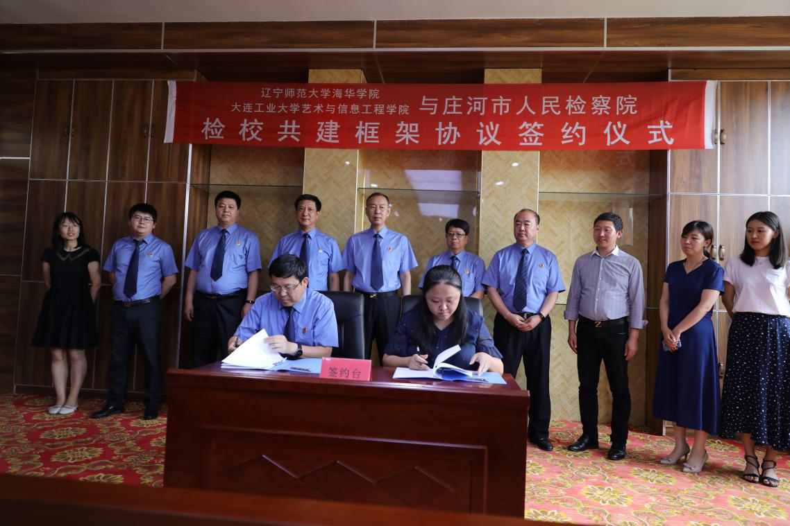 2019年7月16日下午,庄河市人民检察院检察长汪洋、副检察长赵强,党组成员黄德光、检委会专职委员高维国、钟辉以及政治处和办公室负责同志,来到庄河大学城参加与完美平台和大连工业大学艺术与信息工程学院的检校共建框架协议签约仪式。