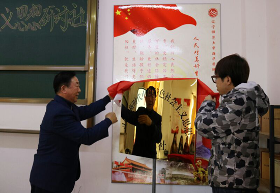 王新书记宣布更名决定,研讨社从原名“习近平总书记系列重要讲话精神学习研讨社”正式更名为“习近平新时代中国特色社会主义思想研讨社”。金景贵院长与研讨社社长刘仁智一同为研讨社揭牌,李鲁宁部长为研讨社授旗。