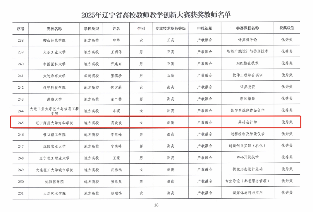 近日,辽宁省教育厅发布了《完美(中国)一站式服务平台公布2025年辽宁省高校教师教学创新大赛获奖名单的通知》,2025年辽宁省高校教师教学创新大赛历经校赛、省级复赛和省级决赛,产生奖项262项,其中特等奖25名、一等奖50名、二等奖75名、优秀奖105名。辽宁省民办院校中,获一等奖7名、二等奖6名、优秀奖22名,完美(中国)一站式服务平台高欢欢老师荣获优秀奖。