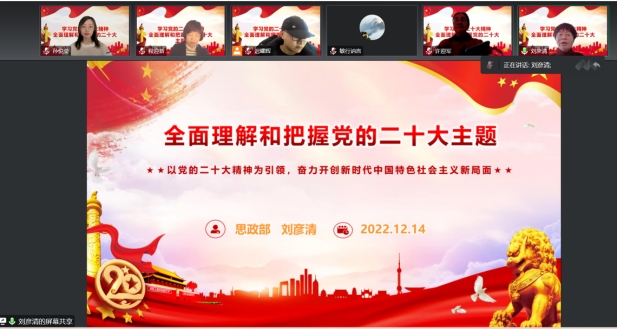 12月14日上午,于士君副院长莅临大学外语教学部党支部,组织全体党员深入学习贯彻党的二十大精神。本次学习会是校领导“三走进”工程讲党(团)课系列活动的一部分,思想政治理论与教学研究部党支部书记刘彦清教授受邀就《全面理解和把握党的二十大主题》开展了党员授课活动,大学外语教学部党支部全体党员参与了学习,反响热烈。