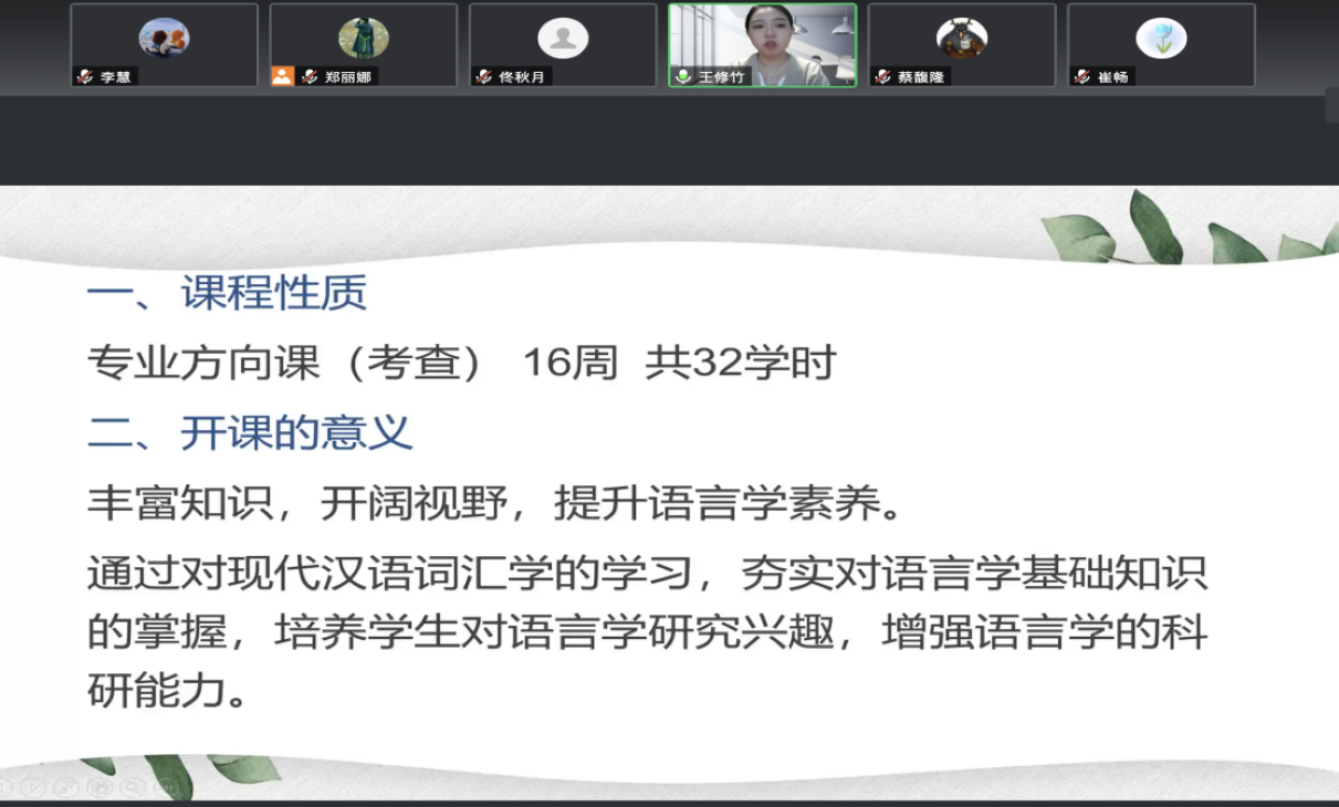 为确保教学质量,提升中文系教师教学能力和教学水平,保证新学期线上教学的顺利进行,中文系于9月7日下午16:30开展学期初说课活动。此次说课安排主要是本学年新入职的五位教师。由中文系郑丽娜主任主持。与会的还有教学院长于士君、教师发展中心主任梅显懋、主任助理蔡馥隆以及各个教研室负责人。