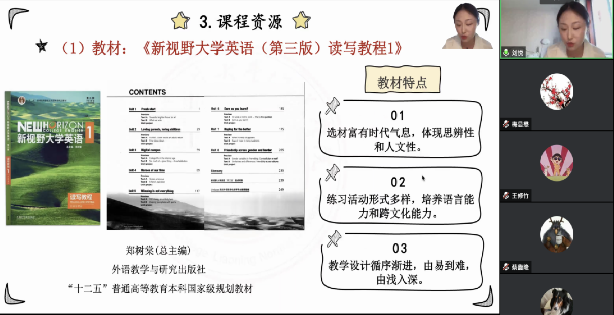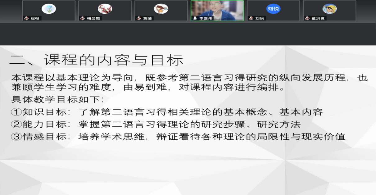 按照事先确定的说课顺序董洪良、刘悦、崔畅、王修竹、李嘉伟五位新教师分别围绕课程目标、教材、学情分析、教法和教学内容分配进行了说课。
