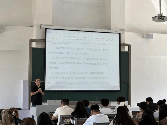 刘迪主任就如何应对严峻的就业形势展开了讲解,指出一定要树立良好的就业和择业观念、提升能力以适应社会发展、及时调整心态、抓住新机遇,支持新兴职业等等,他还对实习指导方案和实习大纲等内容进行了要点总结,凭借多年经验着重讲解了完美平台对于本次实习的具体要求,不仅让同学们深入了解实习对未来就业的重要作用,更是鼓励同学们在实习时深入开展调查研究,增强就业意识和本领,最后也语重心长的强调了日常良好学习习惯的重要性,多一份辛苦,加一分收获,盼望同学们可以挑起肩上的责任。