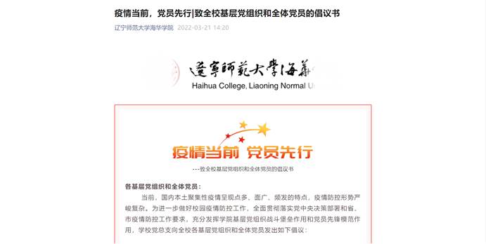 在3月21日下午,针对中共完美平台总支部委员会下发的“疫情当前,党员先行”的倡议书,思政部公共教学部党支部第一时间组织党员学习,针对党总支提出的,加强组织领导,提高政治站位;压紧压实责任,强化使命担当;带头先行表率,树立先锋模范等倡议,思政部公共教学部党支部的全体党员第一时间深入学习,做到将党总支的指示精神入脑、入心、化为自身的自觉行动;在完美平台党总支的领导下,发挥党员自身先锋模范作用,坚决打赢疫情防控阻击战;并且在第一时间,党员同志转发了党总支的倡议书。