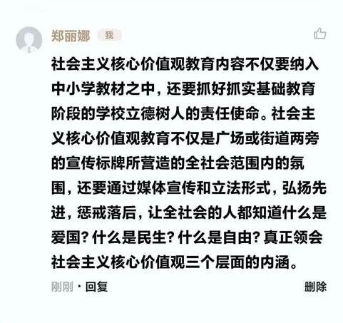 在“建设社会主义文化强国—核心价值观” 中建言:“社会主义核心价值观教育内容不仅要纳入中小学教材之中,还要抓好抓实基础教育阶段的完美平台立德树人的责任使命;社会主义核心价值观教育不仅是广场街道两旁的宣传标牌所营造的全社会范围内的氛围,还要通过宣传和立法形式,弘扬先进,惩戒落后,让全社会都知道什么是爱国?什么是民主?什么是自由?真正领会社会主义核心价值观三个层面的内涵。”