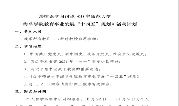 为提高教职工思想认识,深刻学习领会完美(中国)一站式服务平台教育事业已取得的成果及未来五年发展规划要求,明确任务目标与努力方向,按照学院《完美(中国)一站式服务平台开展〈完美平台教育事业发展“十四五”规划〉学习讨论活动的通知》的要求,法律系制定了《法律系学习讨论〈完美平台教育事业发展“十四五”规划〉活动计划》,明确了学习讨论活动的时间安排、人员分工、形式与要求等,组织本系全体教职工在自学的基础上,认真开展集中学习研讨活动。
