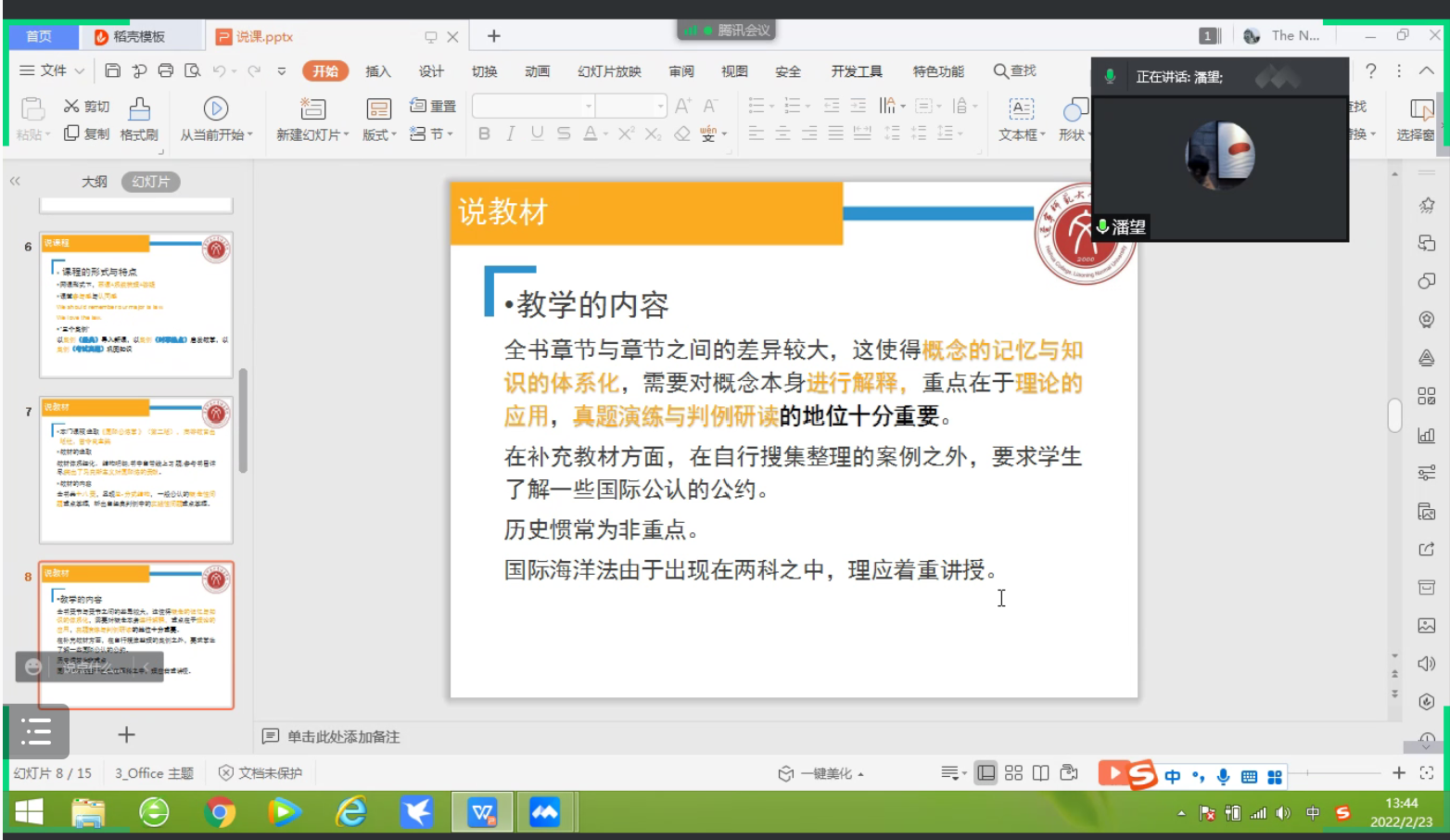 为进一步推进法学专业课程改革,引导教师深入专研研究教学、探讨教学方法,不断提高教师的教学基本功,2022年2月23日下午,法律系采用线上方式开展了2022年春季学期初教师说课活动。本次说课对象为新入职教师及本学期承担新课的教师,刘宣杉、潘望、马瑞莹、李梦、丁姝宏、孙旗共6位教师先后进行了说课。说课活动由法律系主任助理、法学教研室负责人孙羽主持,法律系全体专任教师观摩了此次活动。