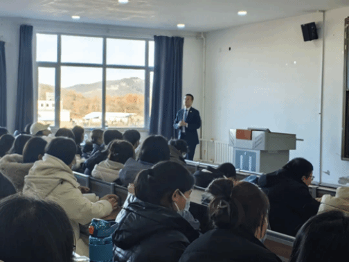 院长助理兼法律系主任王树海、教研室负责人王允泽、学生工作负责人董文泉、部分教师和2023级全体学生参加讲座。讲座由王树海主持。