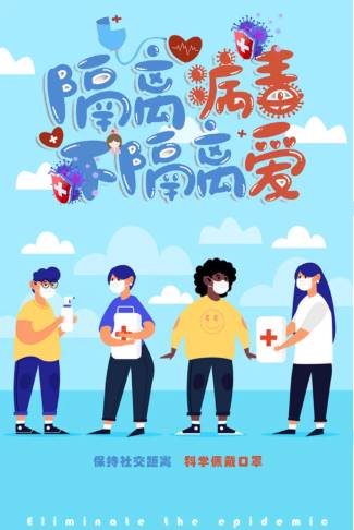 本设计源于对线下新冠疫情的发展形式及人与人之间仍然存在的“爱”作为设计初衷。蓝天,白云,予以终有一天,光明会降临大地。我们虽然身处疫情防控的管制之下,病毒无处不在,医生,小孩,老人,和青年,我们人与人之间的羁绊永远不会“隔离”,在此呼吁大家,保持社交距离,科学佩戴口罩。