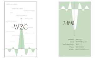 名片图案运用函数图像作为主题图形。名片正面以三角函数公式和函数图像为背景,使得名片本身更具有数学的感觉,条理清楚。名字字母缩写为主题,放置画面中心位置,突出主体。颜色正面以白色为主,浅绿色为辅,给人以干净的感觉。名片背面同样运用了函数图像,和正面相呼应,相联系。背面以名字为主题,联系方式为第二主题,运用中轴对称排版。颜色上以浅绿色为主,白色为辅,和正面相呼应。