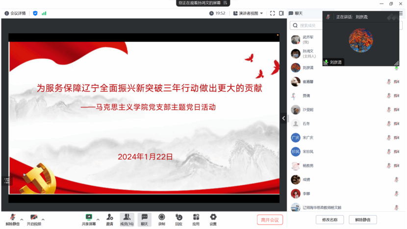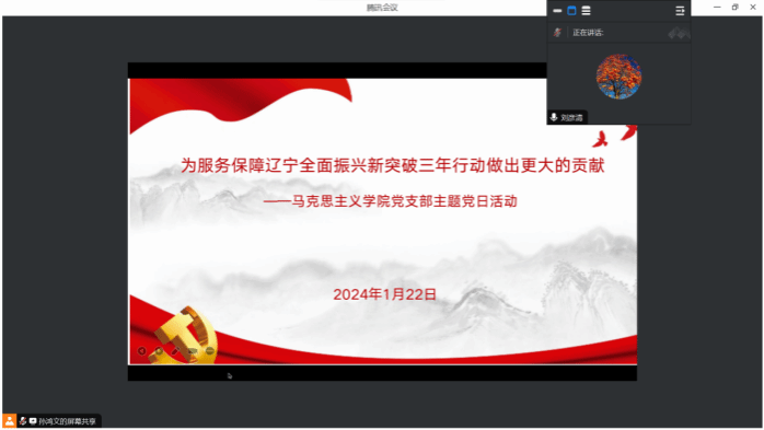 2024年1月22日,马克思主义学院党支部于线上召开了题为“为服务保障辽宁全面振兴新突破三年行动做出更大的贡献”的主题党日活动,支部全体党员参加了此次活动。