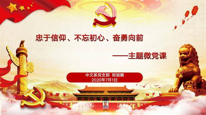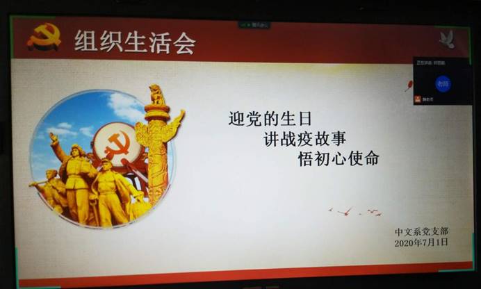 7月1日下午,中文系党支部通过腾讯会议APP依次开展了以“忠于信仰、不忘初心、奋勇向前”为题的微党课和以“迎党的生日、讲战疫故事、悟初心使命”为主题的组织生活会。本次会议由党支部书记郑丽娜同志主持,支部全体师生党员参加了本次活动。