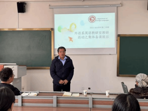 为响应加快建设高水平本科教育、全面提高人才培养能力的号召,促进外语系专业一流课程建设与教学发展,外语系全体教师于3月13日下午在5-102室举行教研室系列活动之一:集体备课活动展示,特邀请监评办主任梅显懋教授及教学督导许迎军教授莅临指导。本次教研活动由外语系教学副主任姚承胜副教授主持,活动内容主要围绕第二外语英语四与理解当代中国翻译篇两个课程组分享集体备课中的教学设计研讨和说课进行展示。