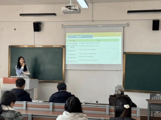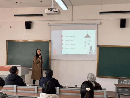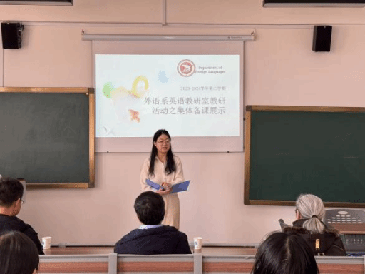 讨论后,首先由陈晨老师进行了说课展示,陈老师分享了理解当代中国翻译的教学设计思路,并详细讲述了如何在教学过程中引导学生使用翻译策略。然后由孙立红老师讲述集体备课成果,将教学理念及教学方法融入到教学过程的每一步教学设计当中。随后,英语教研室孙瑶、张雪两位老师对翻译课程组所做的教学设计进行点评,肯定课程组教师对教学活动的创新之处,对翻译教学方法也提出了改善建议。