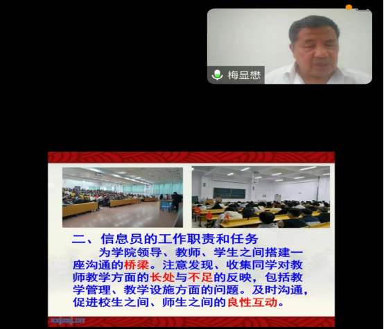 为了加强教学质量管理,完善教学信息反馈机制,更好地发挥信息员队伍的作用,9月11日17:30督导办利用腾讯会议召开了2024级全体新生学生教学信息员的培训动员会议。教学督导办公室主任梅显懋教授、外语学院许迎军教授、马克思主义学院杜晶波教授、信息科学与技术学院副院长李建军副教授、艺术与传媒学院吕俊芳讲师及新任督导员管理学院审计学专业负责人曲俊颖讲师、督导办干事易懿老师出席会议。会议由易懿老师主持。