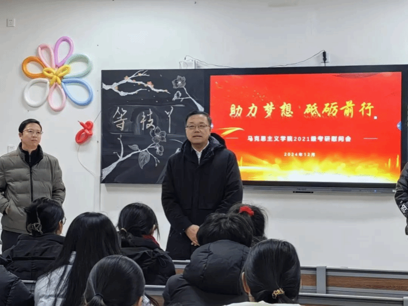 在考研临近之际,马克思主义学院以“等枝丫,成繁花”为主题,召开了一场温馨而庄重的21级学生考研慰问会。马克思主义学院院长刘广东、党支部书记兼副院长刘彦清、副院长孙鸿文、学生工作负责人杨鹏志及各教研室老师齐聚一堂,与 21 级考研学子共话未来,现场气氛热烈,展现出浓厚的师生情谊与学院关怀。