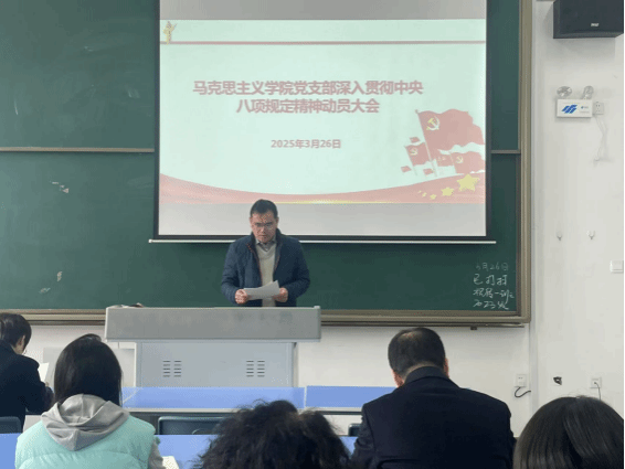为深入学习贯彻习近平总书记的重要讲话和重要指示精神,深刻领悟“两个确立”的决定性意义,坚决做到“两个维护”,切实把思想和行动统一到党中央决策部署和省委工作要求上来,2025年3月26日,马克思主义学院党支部在图书馆A区307教室隆重召开深入贯彻中央八项规定精神动员大会。会议由党支部书记刘彦清主持,支部全体党员参加了本次会议。