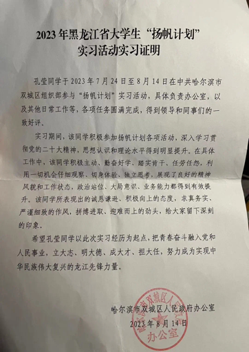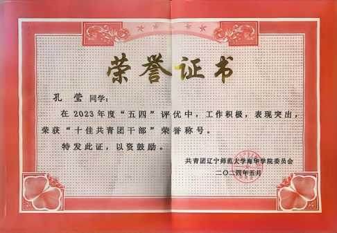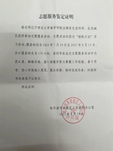 在寒暑假期间,孔莹同学积极参加社会实践活动,2022年4月参加2022年“挑战杯”辽宁省大学生创业计划竞赛;2022年7月,参加2022年暑期全国大学生“三下乡”社会实践;2023年3月参加2023年“挑战杯”全国大学生课外学术科技竞赛;2023年7月,参加全国大学生返家乡社会实践活动,黑龙江省“扬帆计划”活动,2024年1月,参加双城区委大学生寒假“返家乡”实习活动,也参加过社会志愿服务,服务时长现在已经累计300个小时。