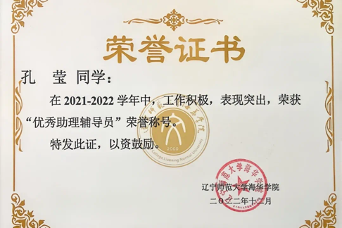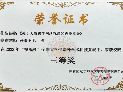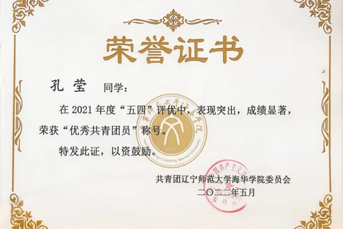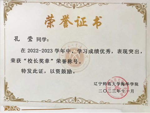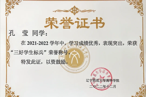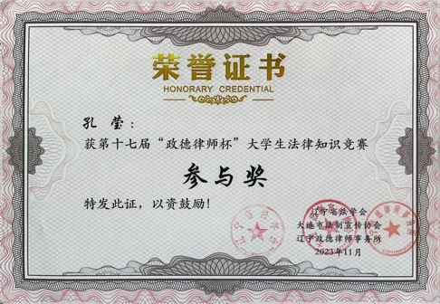曾获辽宁省第十七届“政德律师杯”参与奖,校级“校长奖章”“十佳共青团干部”“三好学生标兵”“优秀学生干部标兵”“三下乡”社会实践活动三等奖,“挑战杯三等奖”等20项荣誉称号及奖项。