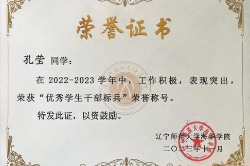 孔莹同学在工作上,态度认真,责任心强,积极参与各项集体活动,凭借较强的工作能力和良好的沟通能力,在班级担任团支书一职,积极向同学们宣传重要文件或重要会议指示和精神,积极鼓励同学参与班级建设,组织同学开展学习竞赛以及开展观看党的二十大开幕、闭幕仪式、观看同上一堂思源大课等活动,帮助同学克服困难,提高学习质量。