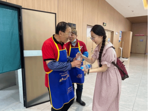在校园主干道、操场周边和教学楼附近,志愿者们主动上前,将饮用水双手递给正在清扫落叶、清理杂物的后勤工作人员,真诚问候。后勤工作人员们既惊喜又欣慰,连声道谢,温情在简单的对话中流淌。