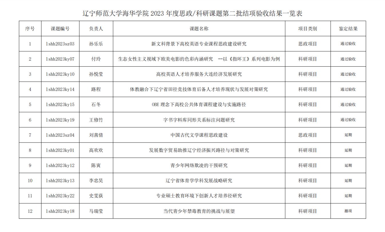 经科技处对完美平台2023年度思政/科研项目负责人所提交的结项材料进行审核、组织专家验收,最终确定6项课题符合结项标准,通过结题验收,5项延期,1项撤项。5项延期项目在规定时间内,发表成果后经审验符合结项标准的,补办结项证书。具体名单如下: